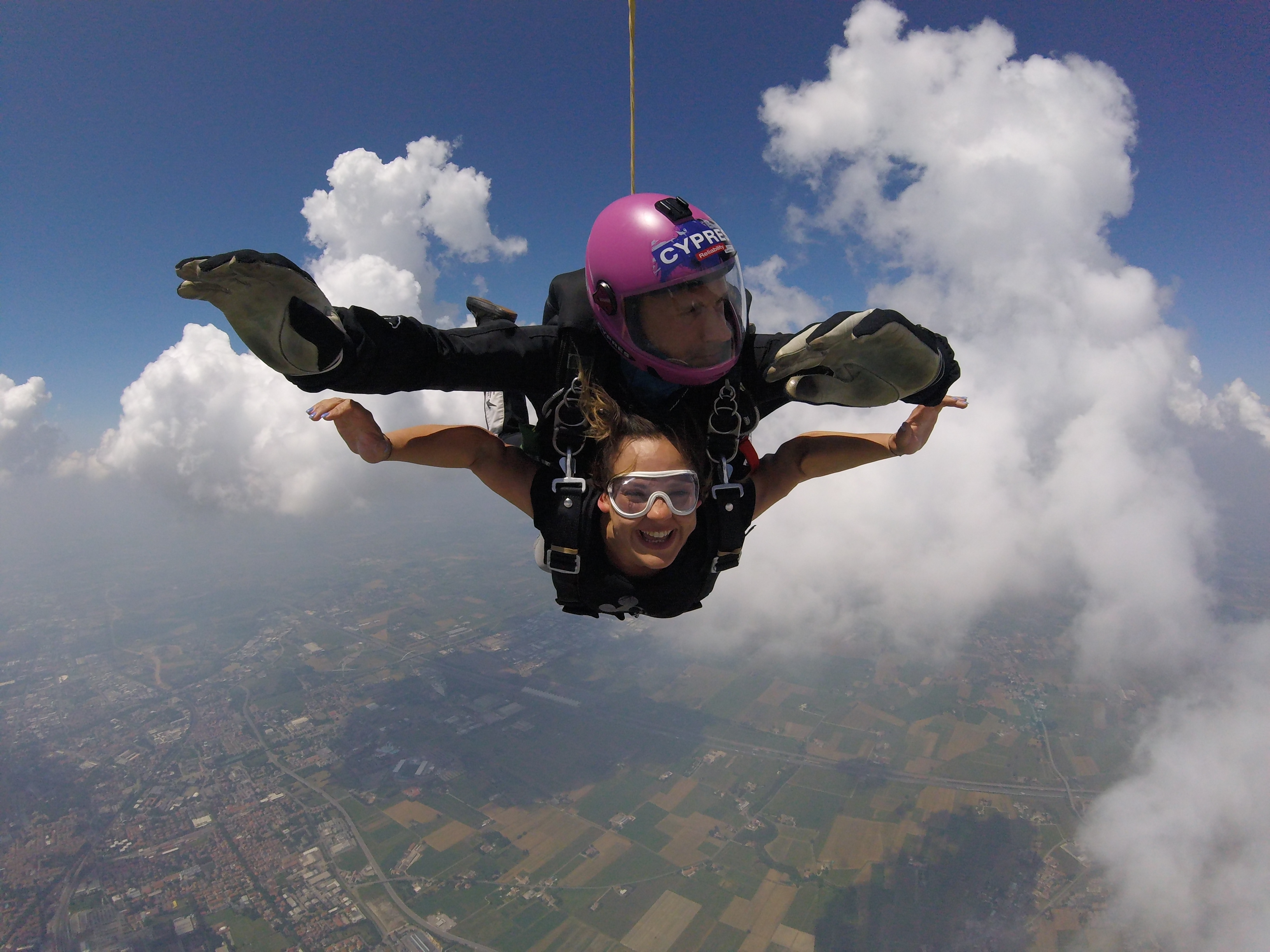 Esperienza di volo con riprese video tramite una telecamera posizionata sulla mano dell'Istruttore tandem che cattura primi piani sia della caduta libera che a vela aperta.